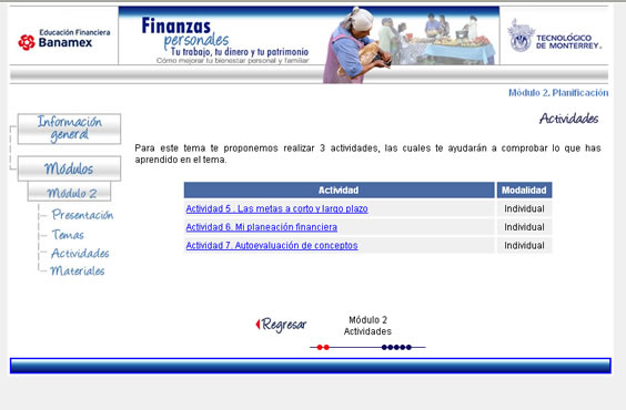 En el botón Actividades de cada módulo, verás una pantalla como la que enseguida se presenta. En esta tabla podrás identificar las actividades que debes realizar en cada módulo. Para entrar a ver la descripción de la actividad, sólo haz clic en las ligas.