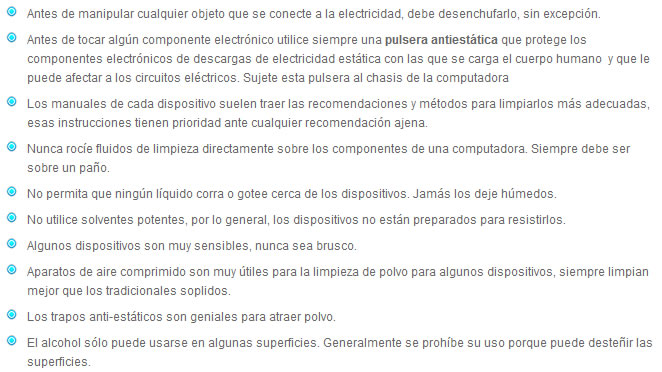 Como se trata de dispositivos electrónicos, se debe tener ciertas consideraciones básicas para manipularlos y cumplirlas estrictamente. Recuerde que incluso puede estar en peligro su vida por la corriente eléctrica.