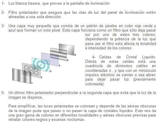La tecnología LCD está basada en cristales líquidos que actúan como persianas las cuales permiten pasar la luz (crear color) o la bloquean (crear negro) originalmente fue creada para las primeras laptops del mercado para obtener mayor ligereza y calidad de imagen, además de menor consumo de poder y menor irradiación de calor.