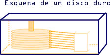 Por ejemplo, una forma sencilla de visualizar un disco duro es con la siguiente imagen, la cual consiste en un conjunto de discos o platos rígidos colocados verticalmente uno encima de otro, herméticamente cerrados en una caja metálica que evita que se pueda deteriorar la superficie de los discos o las cabezas lectoras.