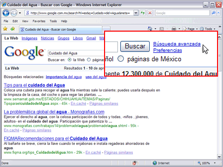 Abra la página principal de Google. A la derecha del cuadro de búsqueda se verá un enlace llamado "Búsqueda avanzada".![]() | |||