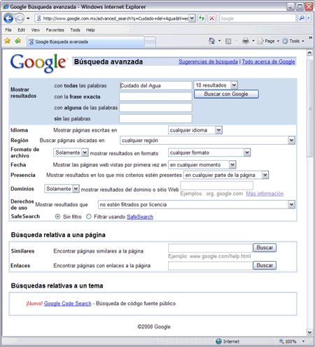 Haga clic sobre la opción Búsqueda avanzada. Se abrirá siguiente página:![]() | |||