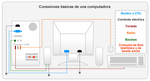 Cualquier tipo de computadora -escritorio y portátil- necesita de ciertas conexiones básicas para su funcionamiento. Observe el siguiente recuadro para revisar las conexiones de una computadora de escritorio: