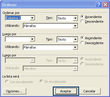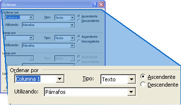 De la sección "Ordenar por" seleccionar la columna que se ordenará, el tipo del dato, si es numérico, texto o fecha. Por último indicar si se quiere ascendente o descendente.
