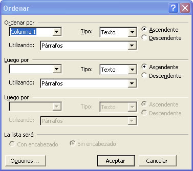 Automáticamente, se abrirá la ventana de Ordenar. |
