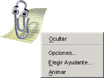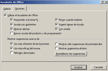 Pulsar, con el botón derecho en el Ayudante de Office y elegir Opciones para abrir el cuadro de diálogo, aquí puede determinar cuándo ha de aparecer el Ayudante de Office así como el tipo de ayuda que éste debe ofrecer.