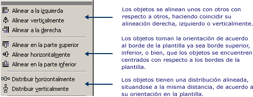 Esta herramienta permite alinear objetos sobre una misma guía o haciendo coincidir ya sea sus centros, bordes izquierdos o derechos, superiores o inferiores, de manera vertical u horizontal o alinear unos con respecto a otro.