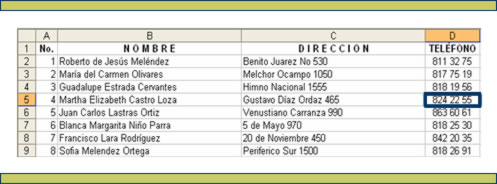 El teléfono de la persona Martha Castro debe ser el siguiente: 820-20-22, y todos los demás están recorridos, entonces debemos insertar una celda en D5 haciendo que el resto de las celdas se recorra hacia abajo.
