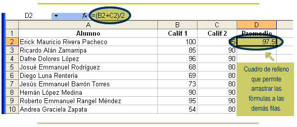 Al contar con los siguientes datos, uno pensaría en escribir una fórmula para cada alumno; sin embargo, después de escribir la primera fórmula, ésta se puede copiar y así terminar todo el cálculo de una forma simple y rápida.