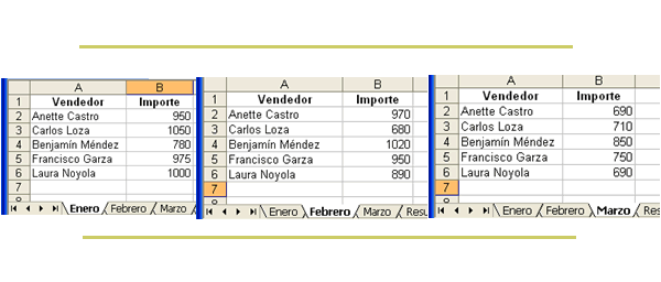Se tienen varias hojas de cálculo. Las ventas de enero, febrero y marzo, con los mismos vendedores y lo que se pretende es obtener la suma de las ventas de los tres meses de cada vendedor.