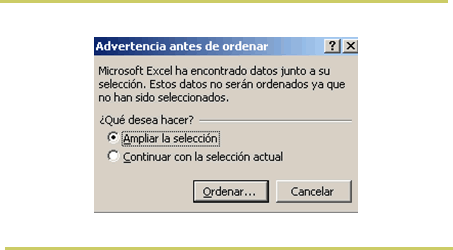 Como se observa en la imagen anterior, si selecciona la información parcialmente, es decir algunas columnas, Excel mostrará el siguiente mensaje: