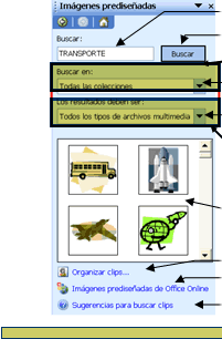 Abrir el menú Insertar (Insert) y enseguida seleccionar el comando Imagen (Picture) y seleccionar la opción imágenes prediseñadas ( Clip Art ) |