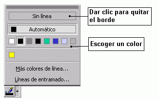 Para quitar la línea del borde de un cuadro de texto, oprima en la barra de herramienta la flecha que aparece junto al botón Color de línea y seleccionar la opción Sin línea.
