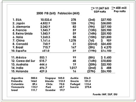 Para conocer más sobre el contexto internacional referente a la economía, el siguiente esquema muestra la nación más grande del mundo en términos económicos del 2002, que fue Estados Unidos con 10.53 trillones de dólares, teniendo como ingreso per cápita 37 mil novecientos dólares.