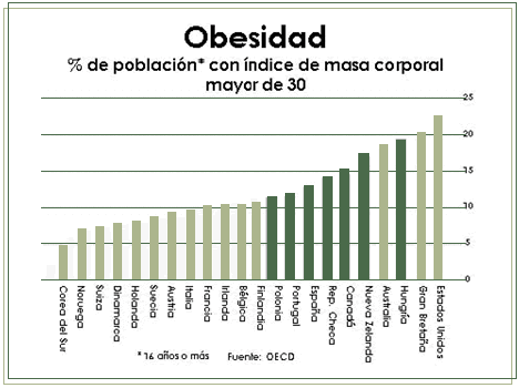 Para seguir con la comparación de países, la siguiente gráfica mide el porcentaje de la población obesa o robusta. El país más robusto es Estados Unidos, después Gran Bretaña y Hungría.