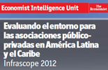Infrascope 2012 Tercera edición de una herramienta interactiva e índice de clasificación que evalúa la capacidad de los países de América Latina y el Caribe para llevar a cabo asociaciones público privadas (APP). El estudio está basado en una metodología desarrolladla en el 2009 y revisada en el 2010. El contenido y el análisis del informe e índice cubren el periodo entre diciembre de 2011 y julio de 2012. Analiza los entornos nacionales para las APP en 19 países. El índice fue elaborado por el Economist Intelligence Unit y cuenta con el apoyo financiero del Fondo Multilateral de Inversiones (FOMIN), miembro del Grupo Banco Interamericano de Desarrollo. |