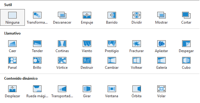 3. Seleccionar la transición de diapositiva deseada. En esta versión, la lista se despliega dando clic en los cuadros de texto, muchas de estas nuevas transiciones son divertidas y acaban con la monotonía de las