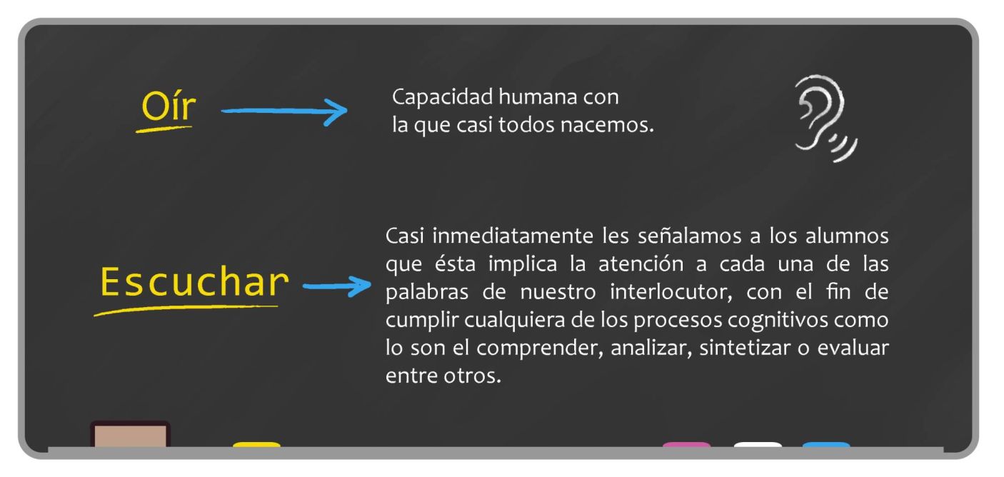 Es una distinción común y conocida el hablar de los conceptos oír y escuchar, el primero como parte de los sistemas del cuerpo humano y el segundo como habilidad que en nuestro contexto educativo se ha manejado solo como el deber de los alumnos o como recomendación previa a la exposición de un tema. Muy pocas veces se ha trabajado en las aulas como una habilidad que forme parte de los saberes que se trabajarán en un curso.