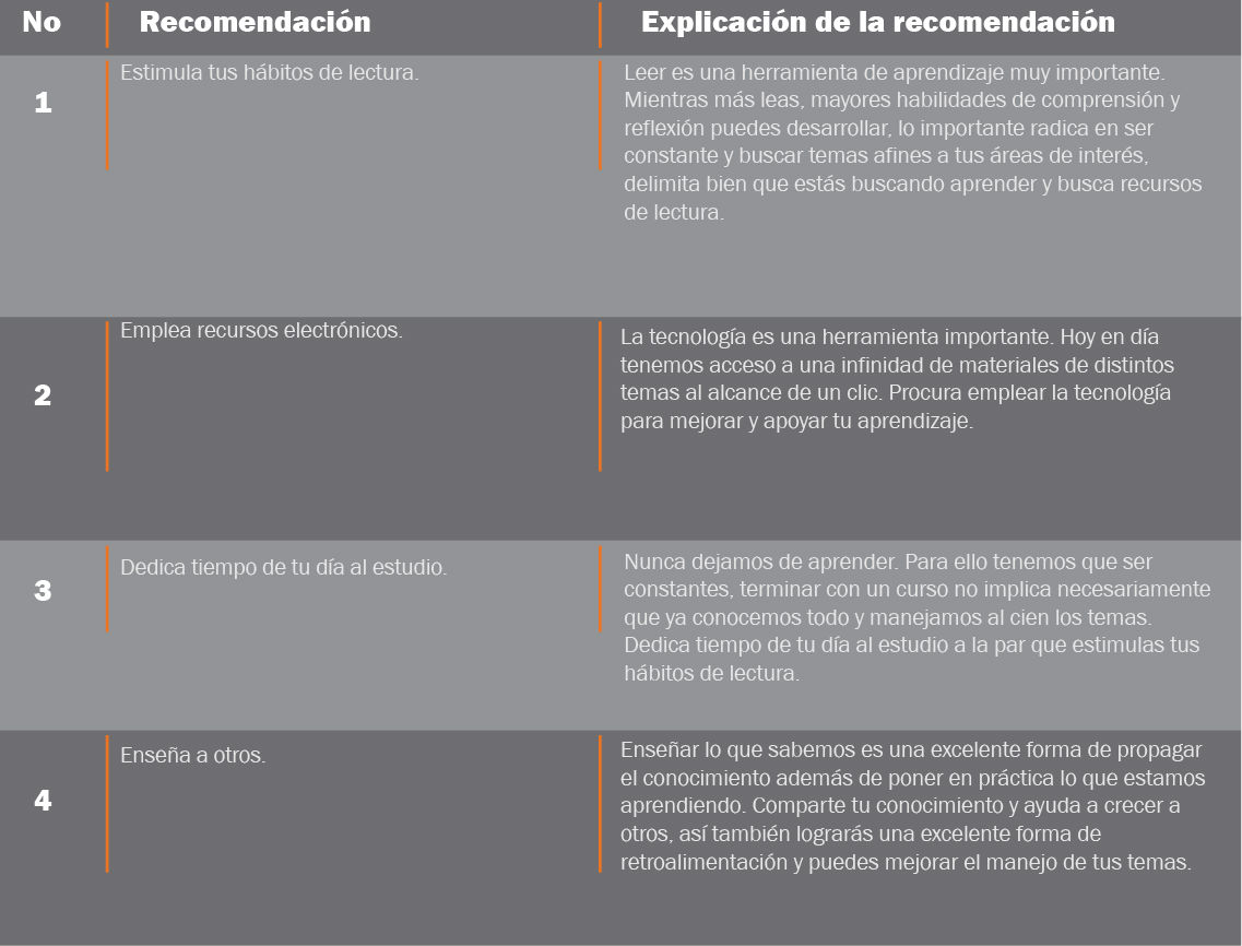 Recomendaciones Revisa a continuación algunas recomendaciones sobre cómo utilizar las evidencias de tu portafolio y cómo seguir desarrollando tus competencias. Haz clic en los enlaces para ver la información.