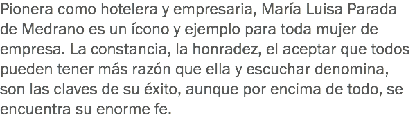 Pionera como hotelera y empresaria, María Luisa Parada de Medrano es un ícono y ejemplo para toda mujer de empresa. La constancia, la honradez, el aceptar que todos pueden tener más razón que ella y escuchar denomina, son las claves de su éxito, aunque por encima de todo, se encuentra su enorme fe.