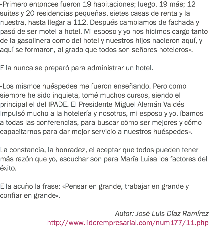 «Primero entonces fueron 19 habitaciones; luego, 19 más; 12 suites y 20 residencias pequeñas, sietes casas de renta y la nuestra, hasta llegar a 112. Después cambiamos de fachada y pasó de ser motel a hotel. Mi esposo y yo nos hicimos cargo tanto de la gasolinera como del hotel y nuestros hijos nacieron aquí, y aquí se formaron, al grado que todos son señores hoteleros». Ella nunca se preparó para administrar un hotel. «Los mismos huéspedes me fueron enseñando. Pero como siempre he sido inquieta, tomé muchos cursos, siendo el principal el del IPADE. El Presidente Miguel Alemán Valdés impulsó mucho a la hotelería y nosotros, mi esposo y yo, íbamos a todas las conferencias, para buscar cómo ser mejores y cómo capacitarnos para dar mejor servicio a nuestros huéspedes». La constancia, la honradez, el aceptar que todos pueden tener más razón que yo, escuchar son para María Luisa los factores del éxito. Ella acuño la frase: «Pensar en grande, trabajar en grande y confiar en grande». Autor: José Luis Díaz Ramírez
