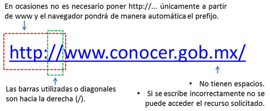 Dirección de Página Web: Un URL de acceso a recursos Web se denota por el prefijo http:// seguido de la dirección de Internet completa del sitio al que se desea acceder.