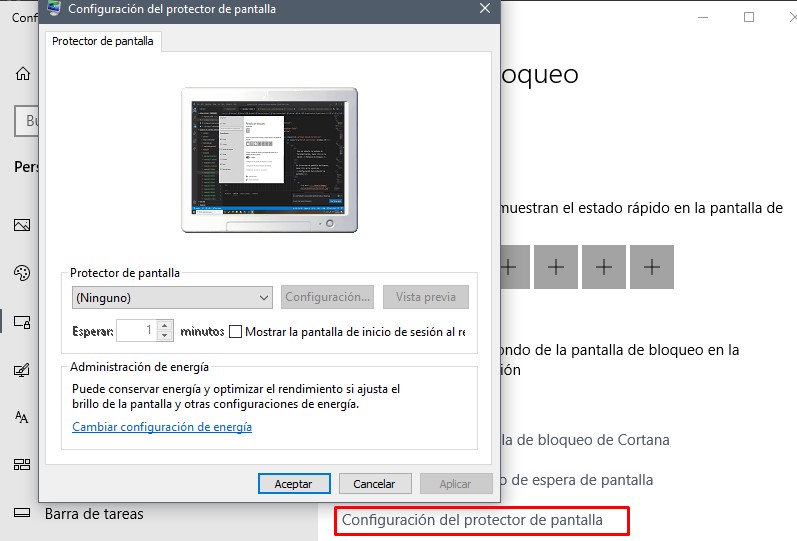 - En la sección de pantalla de bloqueo, hacer clic en la opción de Configuración del protector de pantalla.